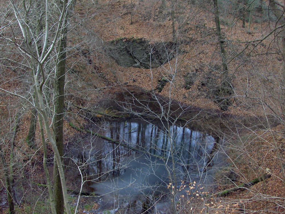 Die hier im Wald gelegene, mit Wasser gefüllte Grube, ist das Relikt eines Tagebaues. Hier, auf der Nordseite des Tönsberges, entdeckte man Anfang des 19. Jahrhunderts bei der Suche nach Steinkohle Ölgestein.